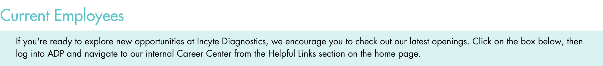 Incyte Diagnostics is an equal opportunity employer. Qualified applicants will receive consideration for employment without regard to race, color, religion, sex, sexual orientation, gender identity, national origin, disability or protected veteran status.